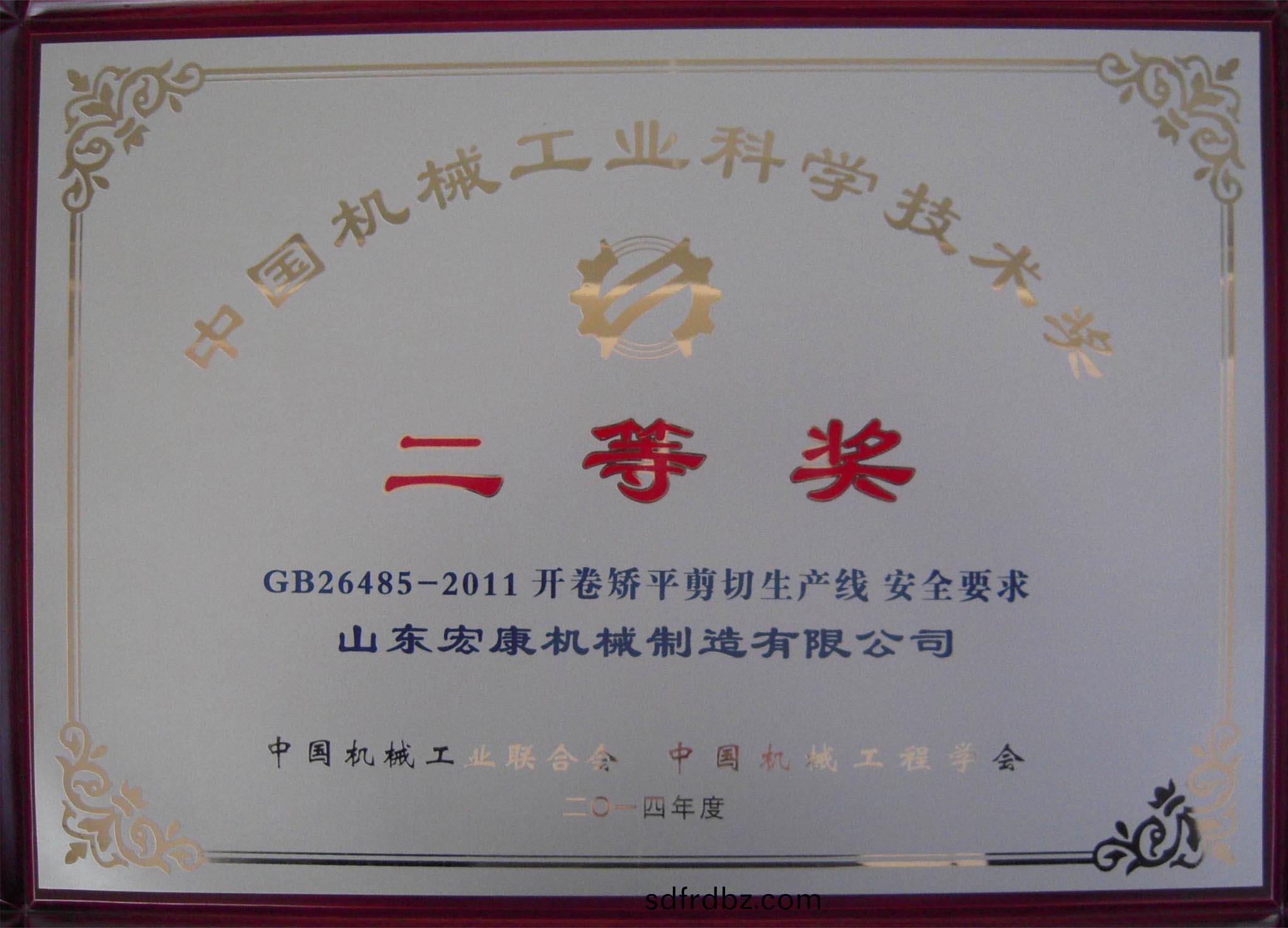 根據中國機械(xie)工(gong)業科學(xue)技(ji)術獎勵工作辦公室《關(guan)于錶彰2014年度(du)中(zhong)國機械工業科學技術獎(jiang)獎勵項目的通報》,集糰公司主持製定(ding)的《GB26485-2011 開捲(juan)矯平剪切生(sheng)産線 安全要求》國傢標準穫中國機械工(gong)業科學技術(shu)進步二(er)等獎(jiang)。