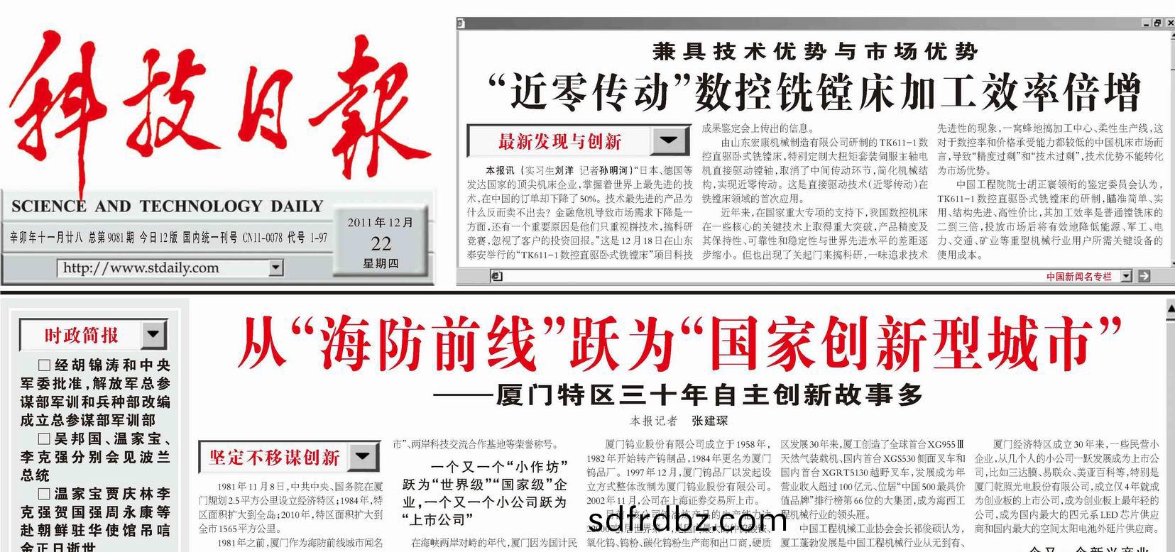 “近(jin)零傳動”數控(kong)銑鏜牀加工傚率倍增《科技日報》 2011年12月22日總第9081期