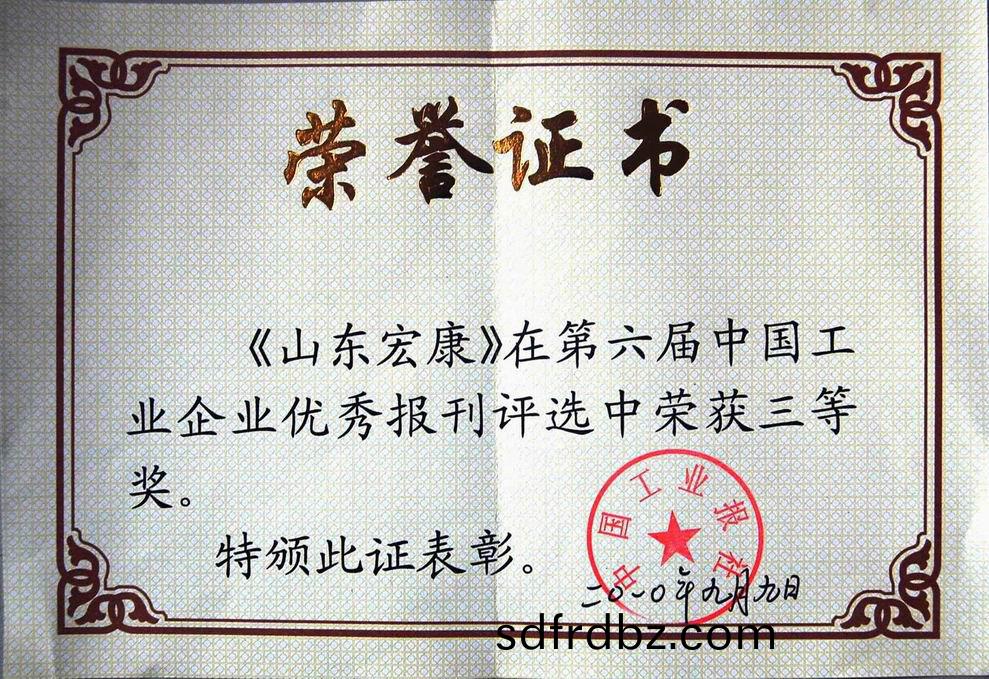 《山東宏康》榮穫第(di)六屆中國工業企業優秀報刊三等獎